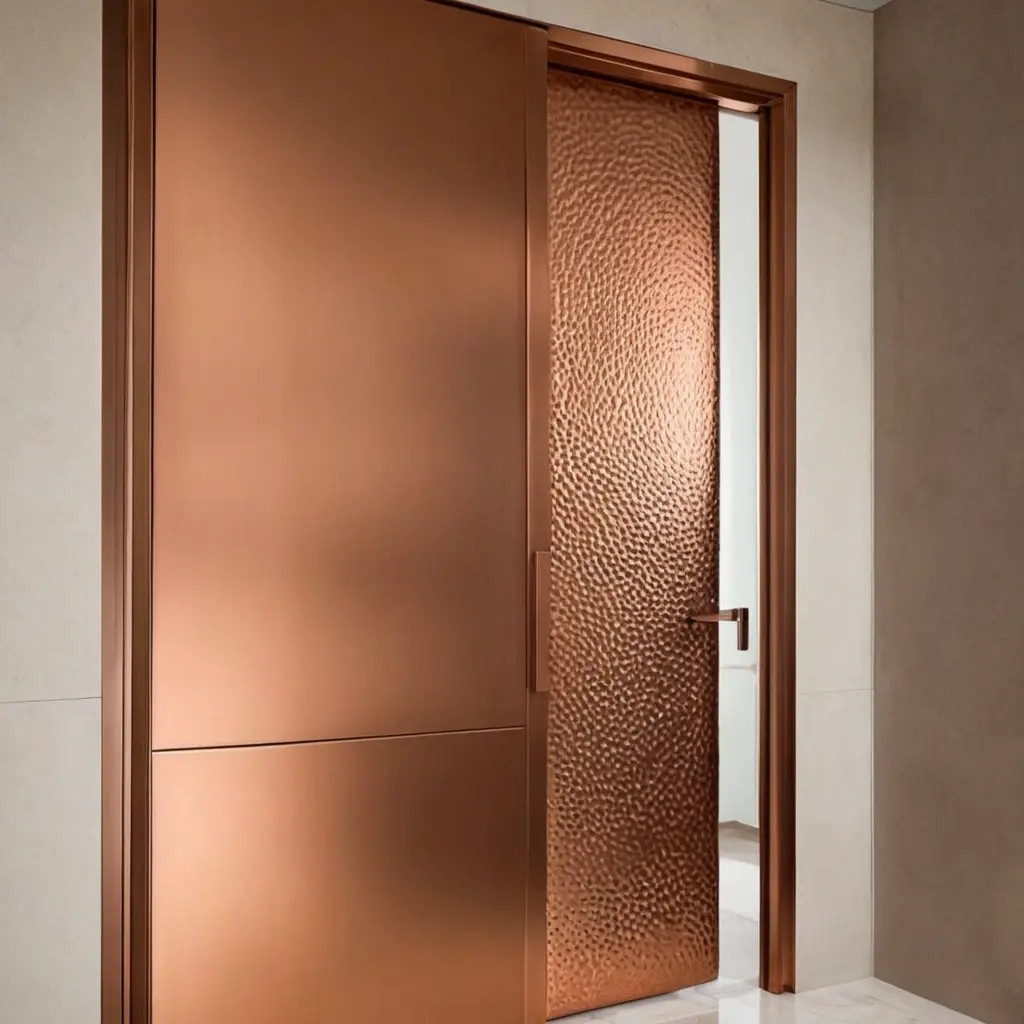 Редкий, но эффектный вариант – покрыть дверь листом меди или использовать цельные панели, которые служат и защитой поверхности, и стильным акцентом.
